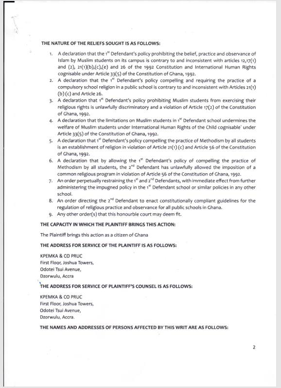 The suit is asking the Supreme Court to declare that the school’s policy prohibiting Muslim students from practising and observing their faith violates Articles 12, 17(1) and (2), 21(1)(b), (c), (e), and 26 of the 1992 Constitution, as well as international human rights laws under Article 33(5).