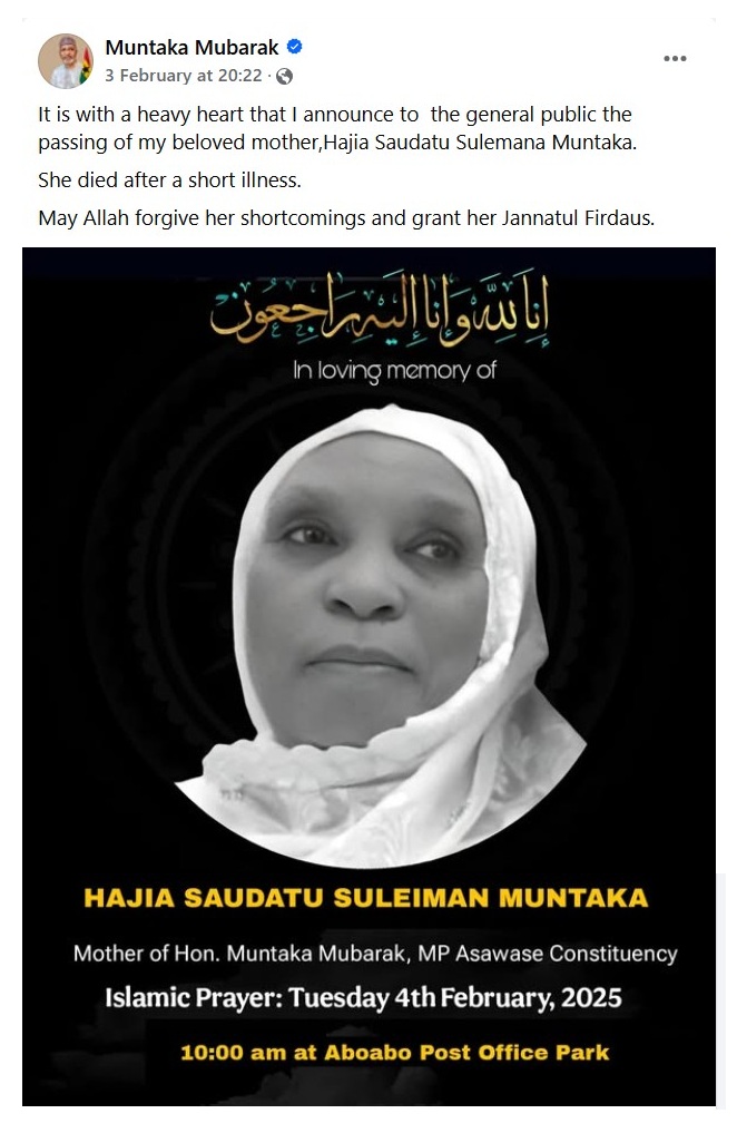 Hajia Saudatu Sulemana Muntaka, mother of Interior Minister and Member of Parliament for Asawase, Alhaji Mohammed Muntaka Mubarak, has passed away at the age of 83.