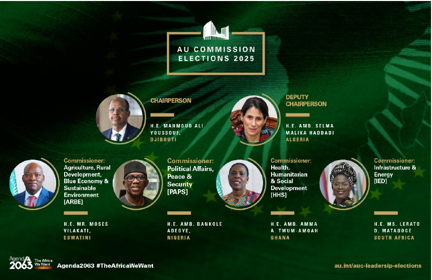 The elections of the Chairperson and Deputy Chairperson were held after the elections and appointments of the AU Commission Commissioners during the 46th Ordinary Session of the Executive Council of Ministers of Foreign Affairs- on 12 February 2025. Commissioners are elected for a four-year term, renewable once. 4 out of the 6 Commissioner positions available were elected. The following Commissioners were elected: