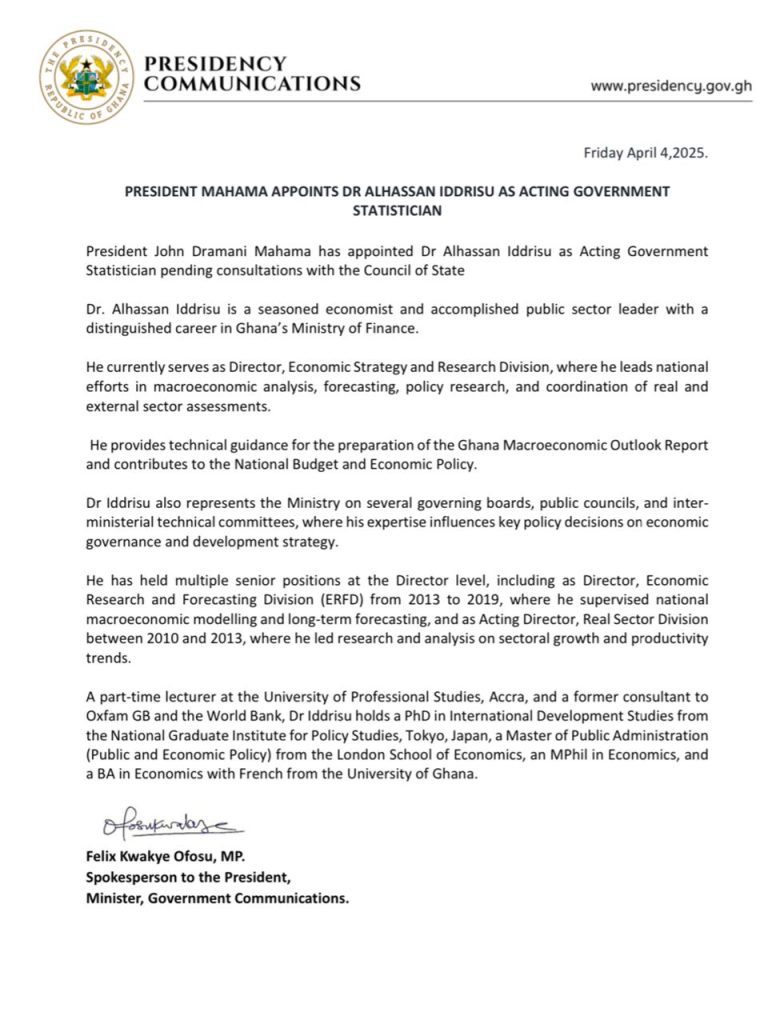President John Mahama has appointed Dr. Alhassan Iddrisu as the Acting Government Statistician, pending further consultations with the Council of State.