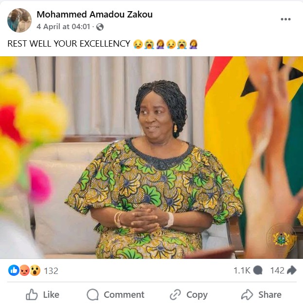 On April 4, 2025, at approximately 4:00 a.m., Zakou made a Facebook post featuring a photo of Professor Opoku-Agyemang, accompanied by the caption, “Rest well, Your Excellency,” along with crying emojis, suggesting sorrow and implying what many interpreted as her demise.
