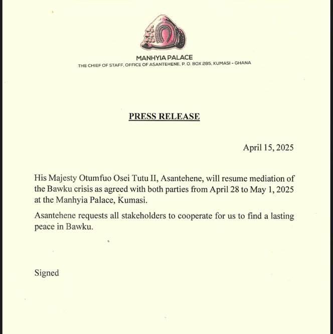 “His Majesty Otumfuo Osei Tutu II, Asantehene, will resume mediation of the Bawku crisis from April 28 to May 1, 2025, at the Manhyia Palace in Kumasi,” the statement noted.
