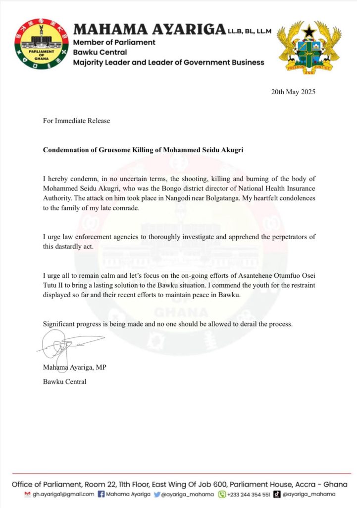 The Member of Parliament for Bawku Central and Majority Leader, Mahama Ayariga, has strongly condemned the killing of Mohammed Seidu Akugri, the Bongo District Director of the National Health Insurance Authority (NHIA), describing it as both “gruesome” and “dastardly.”